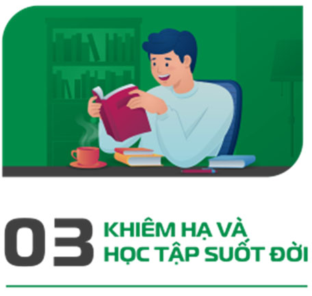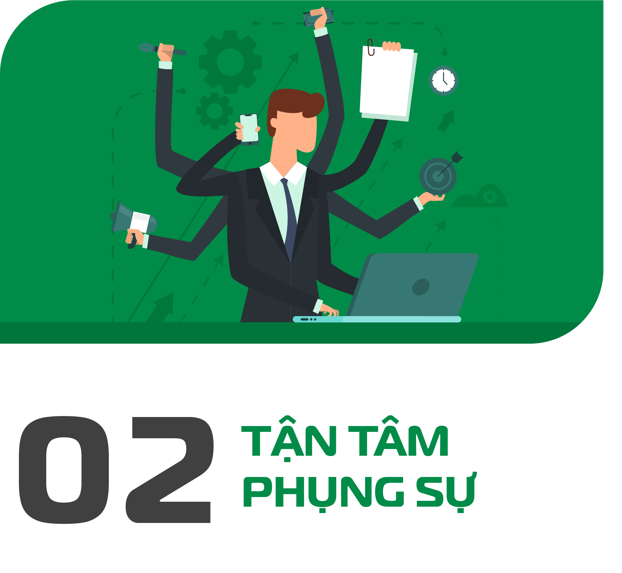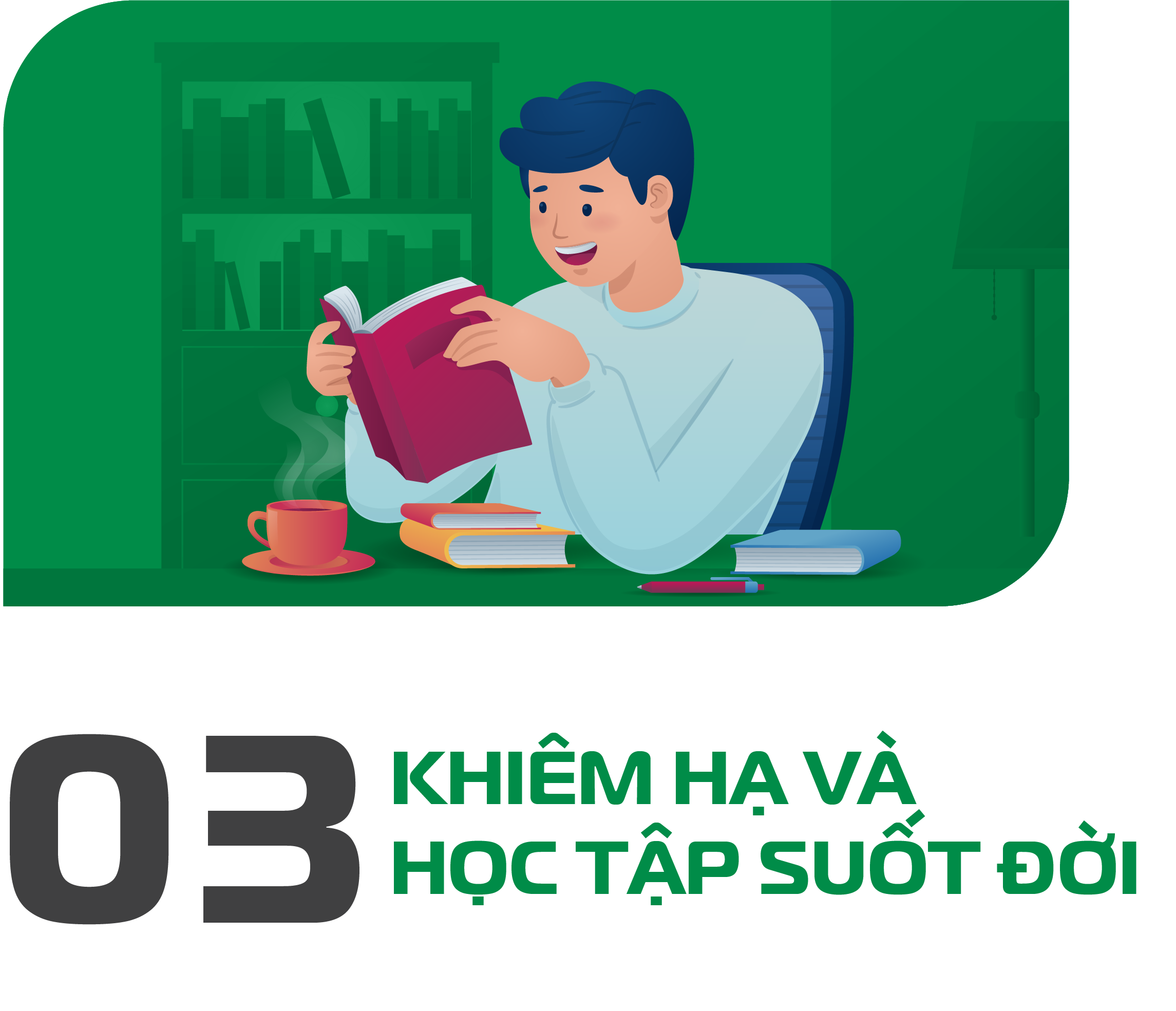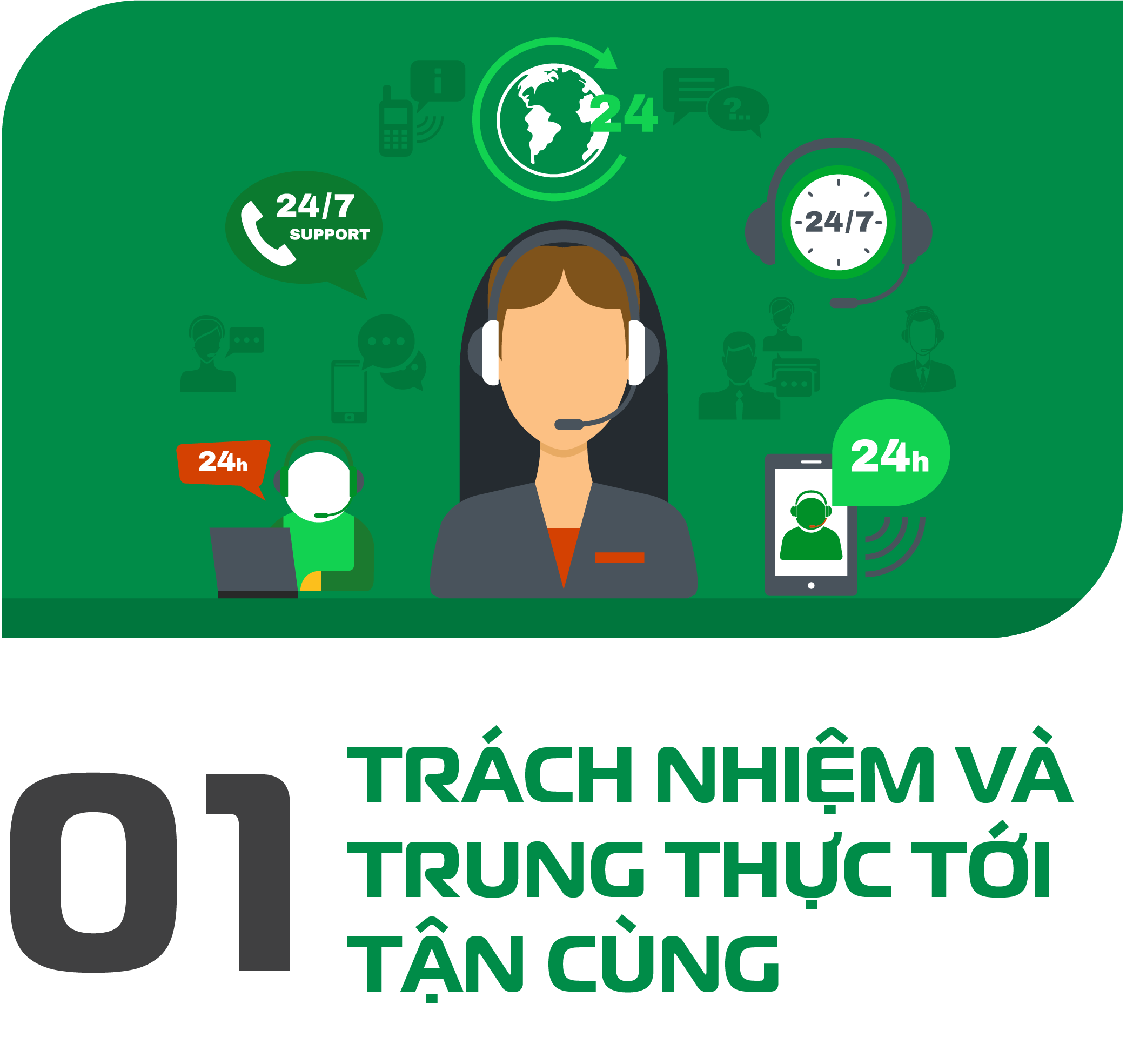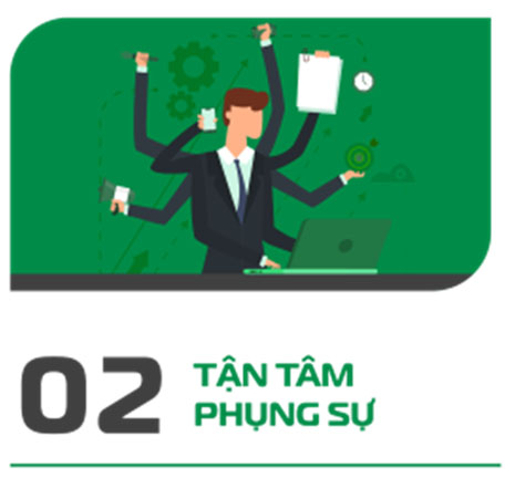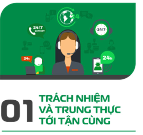 | Với Bản thân - Đồng nghiệp - Khách hàng - Tổ chức cả trong suy nghĩ và hành động. Không gian dối, không đổ lỗi,… | Khách hàng - Đối tác - Đồng nghiệp - Tổ chức cả trong suy nghĩ và hành động vô điều kiện. Không mong cầu đền đáp,... | Luôn khiêm hạ, học tập, tu dưỡng, phát triển bản thân... Không đề cao bản thân, không hơn thua, không so bì,... |