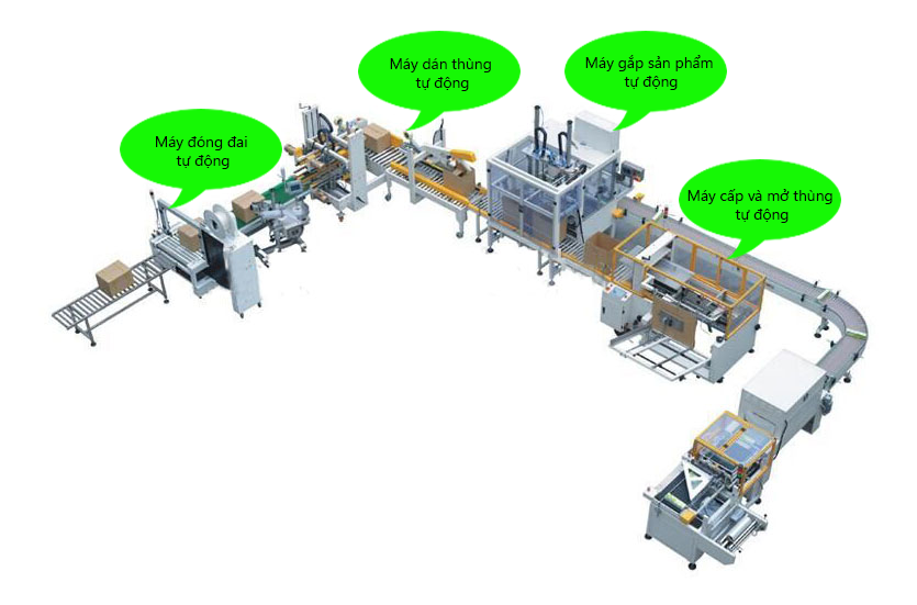 Máy mở và đóng thùng carton tự động: Thay thế hoàn toàn việc gấp thùng thủ công, đảm bảo khung thùng vuông vức.
