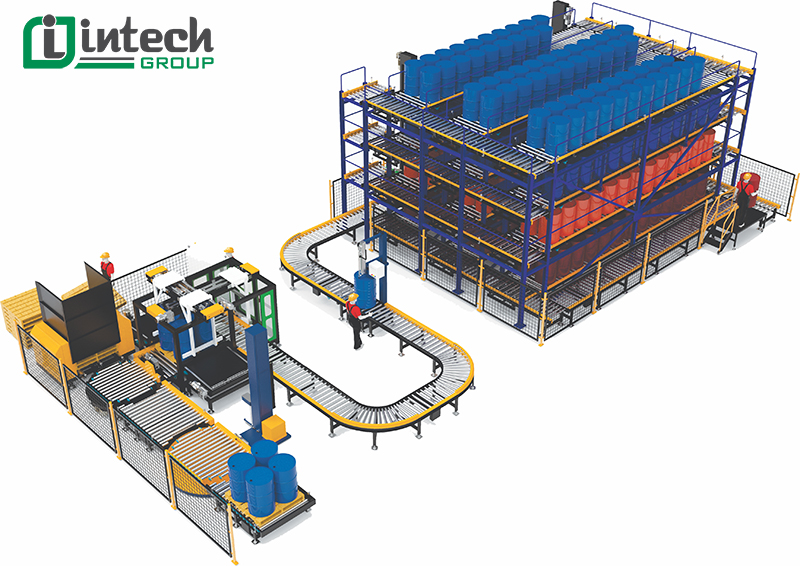 Hệ thống đóng 4 phuy (250kg/phuy) lên một pallet, máy cấp 10 pallet trống tự động, máy quấn màng tự động giúp giảm sức lao động và cải thiện môi trường làm việc.