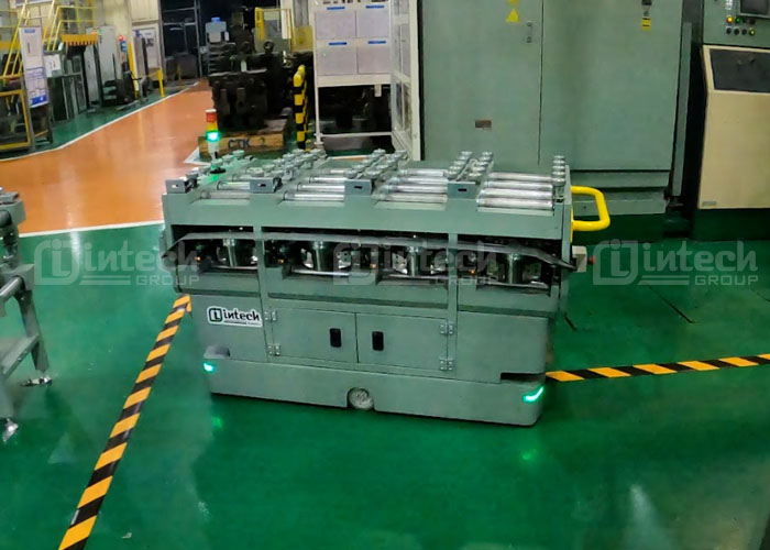 The conveyor integrated self-propelled vehicle, also known as AGV conveyor, is an automated vehicle (Automated Guided Vehicle) with a roller conveyor installed on the vehicle body, allowing automatic loading and unloading and transporting of goods between production stages from areas in the factory or warehouse.