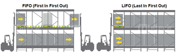 FIFO (first-in, first-out) : pallet đầu tiên được lưu trữ trên mỗi làn kệ sẽ là pallet đầu tiên được dỡ xuống ở làn kệ đó. Xe nâng sẽ hoạt động ở 2 phía của kho: 1 phía lưu trữ hàng, 1 phía dỡ hàng. Thích hợp khi kho được bố trí là vùng đệm giữa 2 khu vực.
