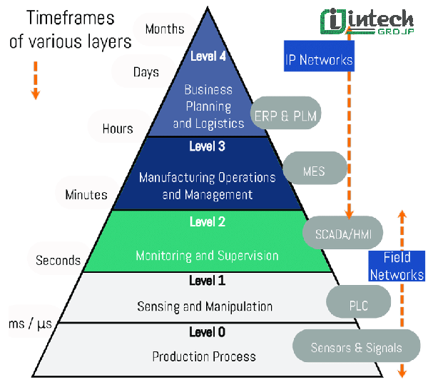 Cấp 5 – Tầng lập kế hoạch kinh doanh và ra quyết định (ERP & PLM): đây là tầng cao nhất trong kim tự tháp tự động hóa thường sử dụng hệ thống quản lý tích hợp ERP. Từ đó người quản lý có thể tự chủ việc kết nối sản xuất, hệ thống thông tin và các phần mềm khác để quản lý và tích hợp dữ liệu với các tầng bên trên